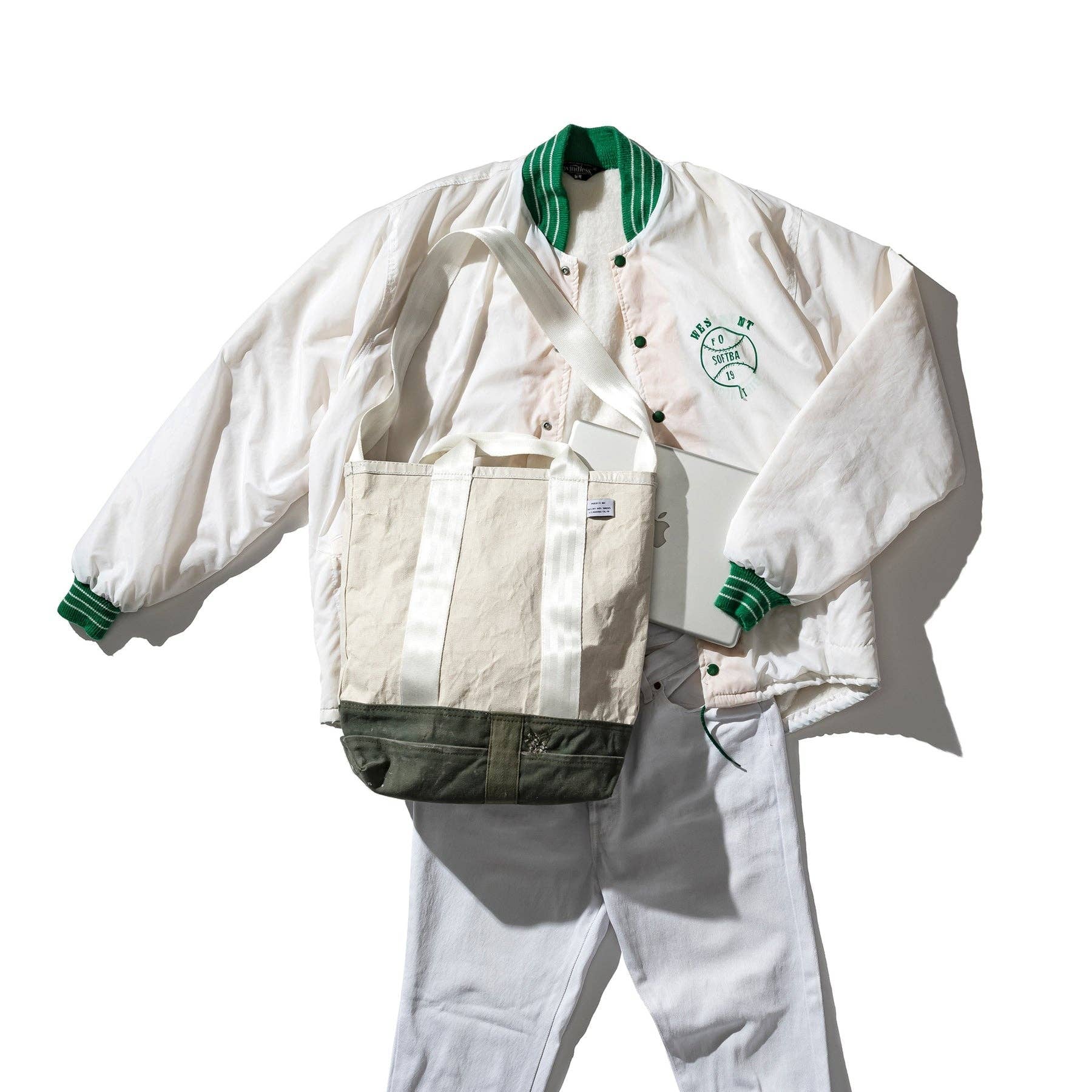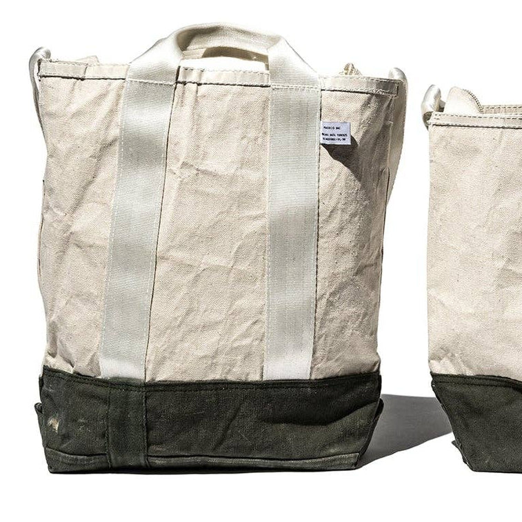 Material: PP Coated Fabric (Cotton, PP, PU, Acrylic), Used Fabric (Cotton, others), Used Belt The inside is laminated, but it is not completely waterproof. Water, friction, and aging can cause the lamination to peel off, wrinkle, or crack. Depending on the environment in which it is used, such as near a heater or in a hot and humid place exposed to direct sunlight, it may discolor or the laminated part may soften and become sticky. The bottom part is made of used fabric, so it may have fading, scratches, stains, tears, holes, etc.