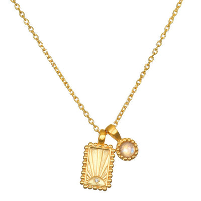 18k gold plate over brass White topaz, Moonstone Necklace length - 18" + 3" ext chain Stone size - 1mm faceted round white topaz; 4mm smooth round cab moonstone
