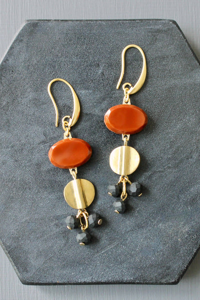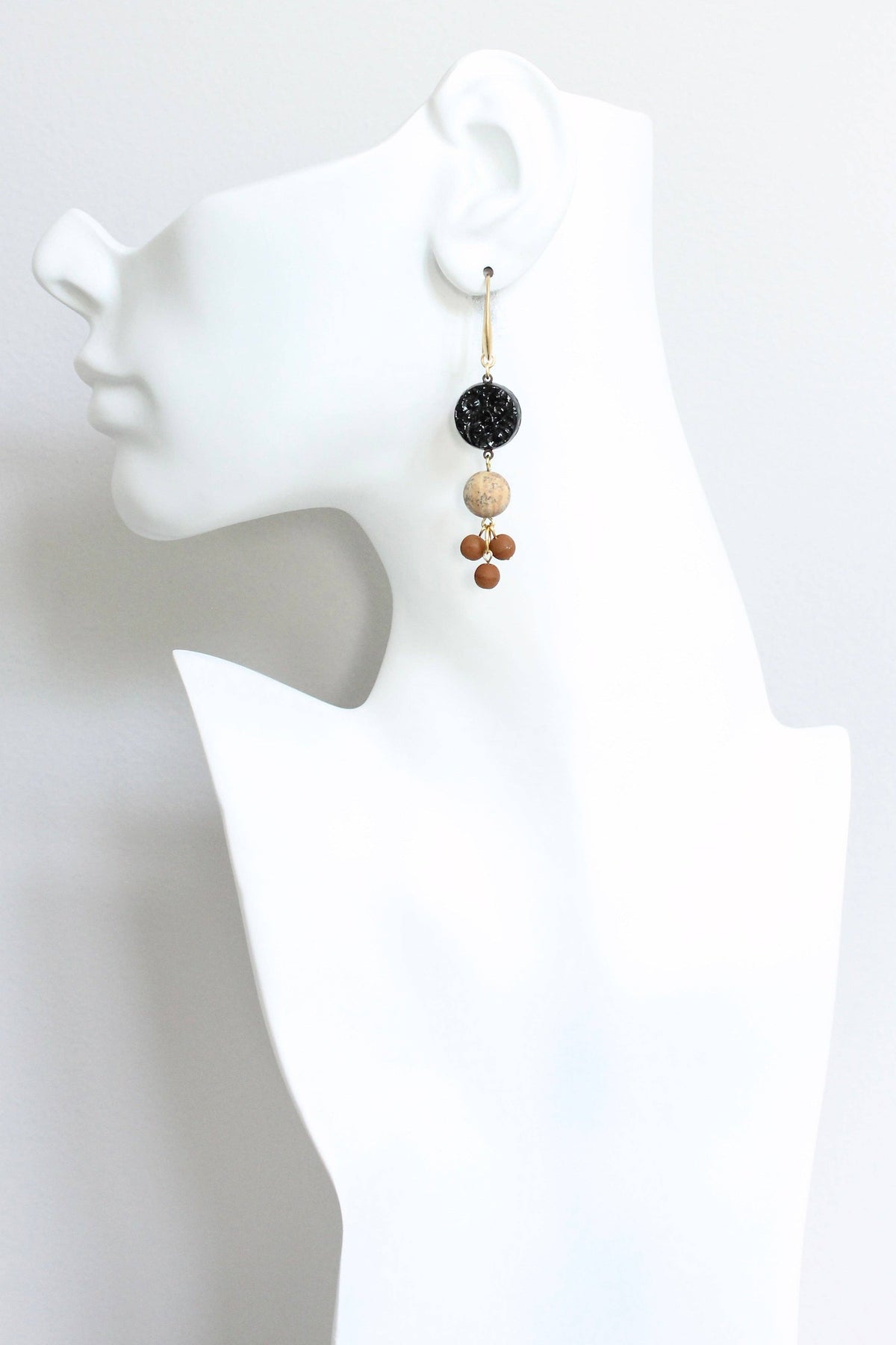18k Gold plated brass hooks with vintage Japanese pressed glass, jasper, and glass. Each earring weighs .225 oz. and measures 2.75 inches in length from top to bottom.