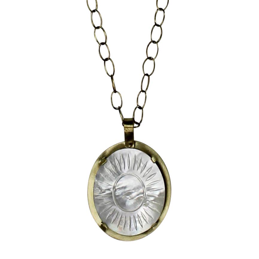 Regular price $82.00 Save $-82.00Zahara Pendant featuring a Mother of Pearl sunburst design, set in brass. The radiant, sunburst pattern adds a striking, luminous touch, creating a bold yet elegant statement piece for any jewelry collection.