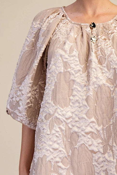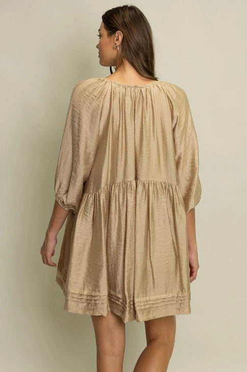 This mini dress is the epitome of refined simplicity with its clean lines, pleated front detail, and elegant wide sleeves. Designed for those who appreciate a minimalist yet sophisticated look, this dress offers a relaxed fit that makes it comfortable for all-day wear. The pleats add subtle structure, giving the dress an elevated appearance perfect for a variety of occasions.