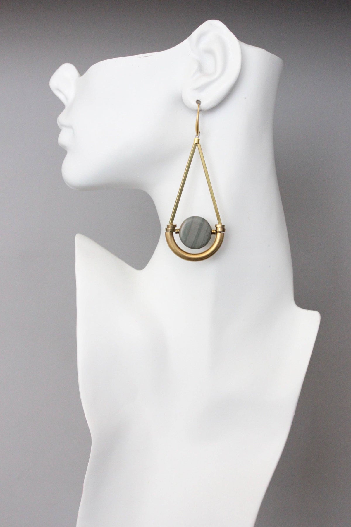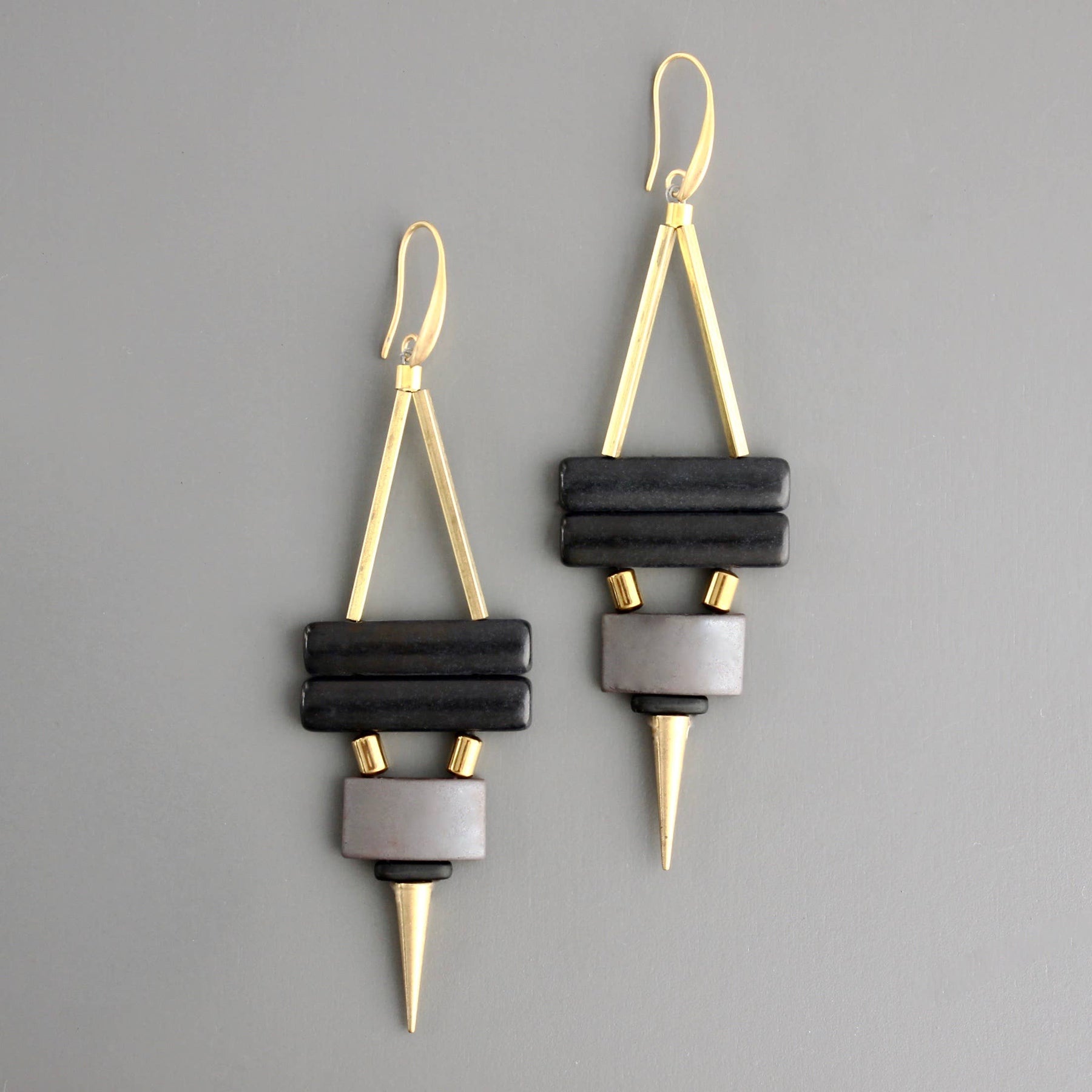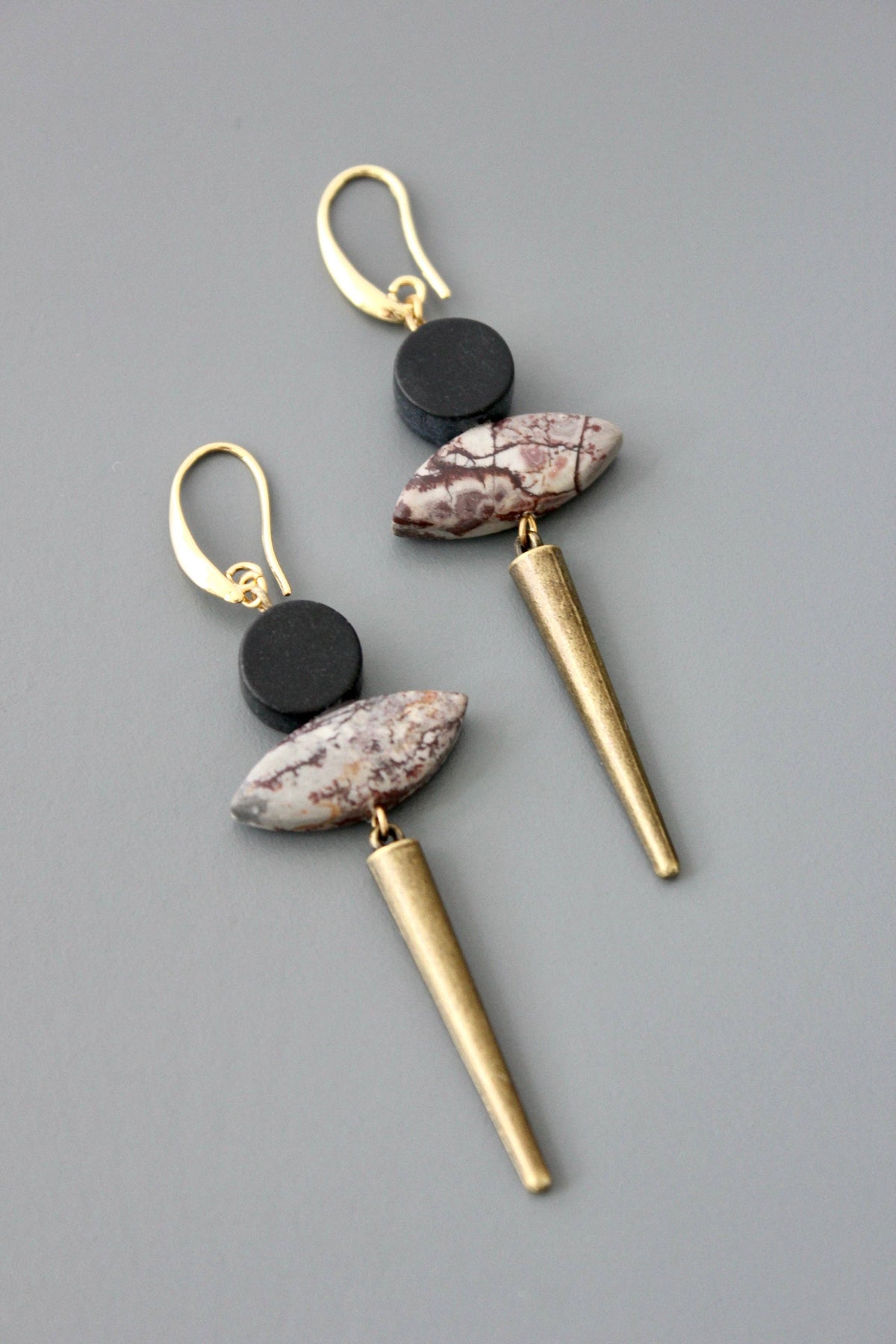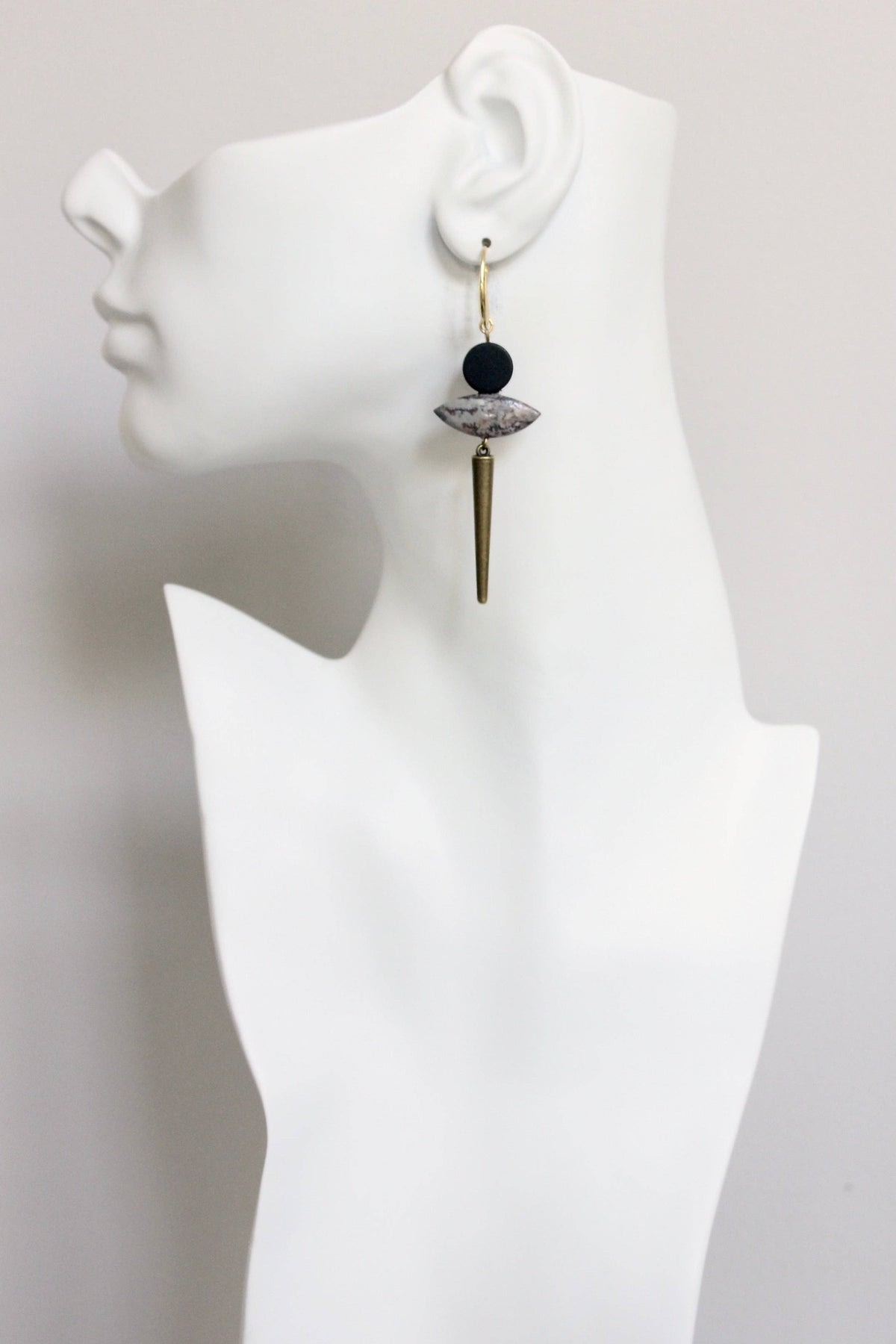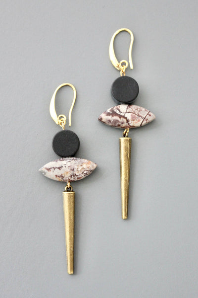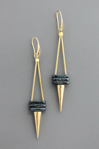 18k Gold plated brass hooks with vintage Japanese pressed glass, jasper, and glass. Each earring weighs .225 oz. and measures 2.75 inches in length from top to bottom.