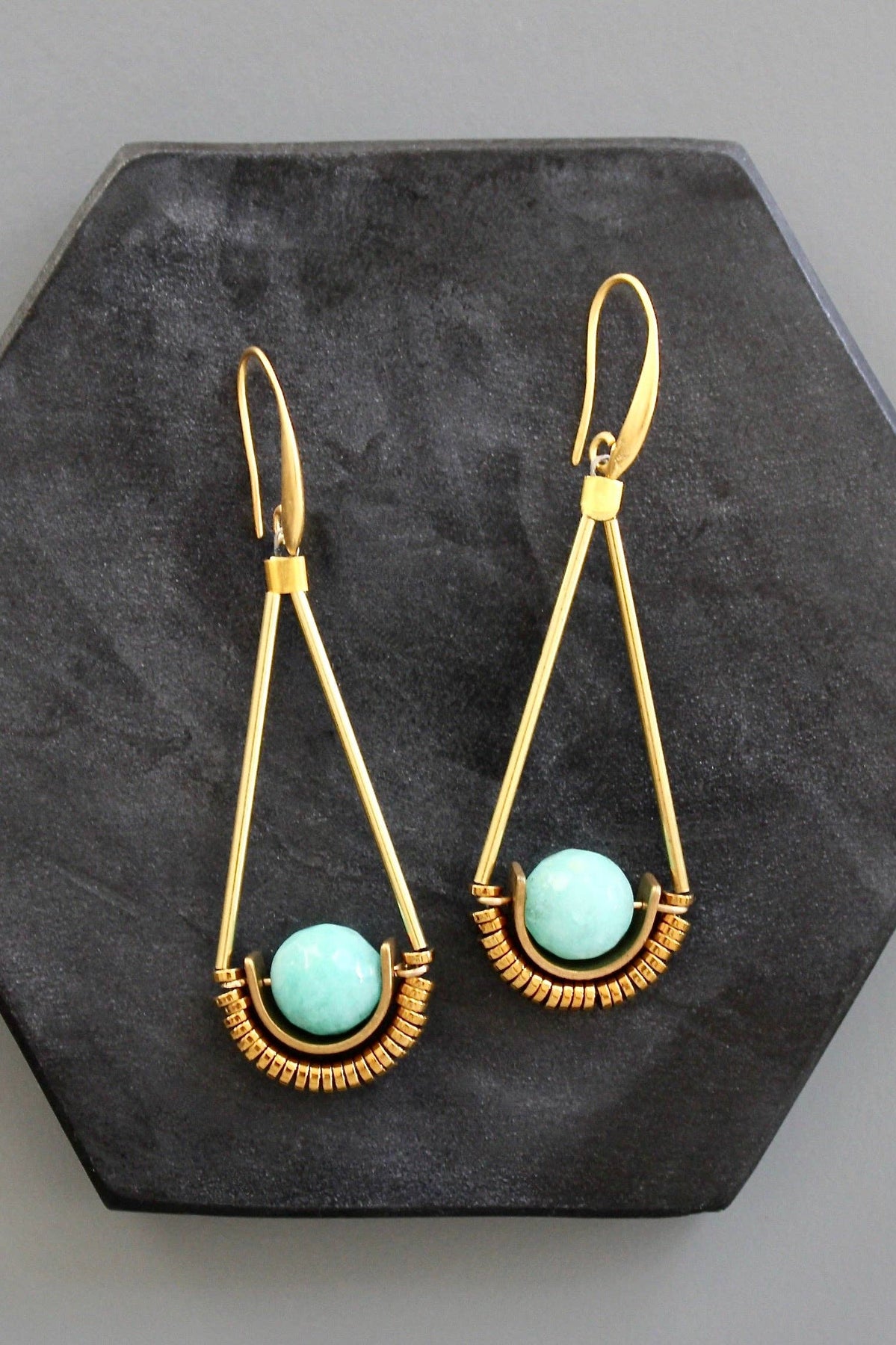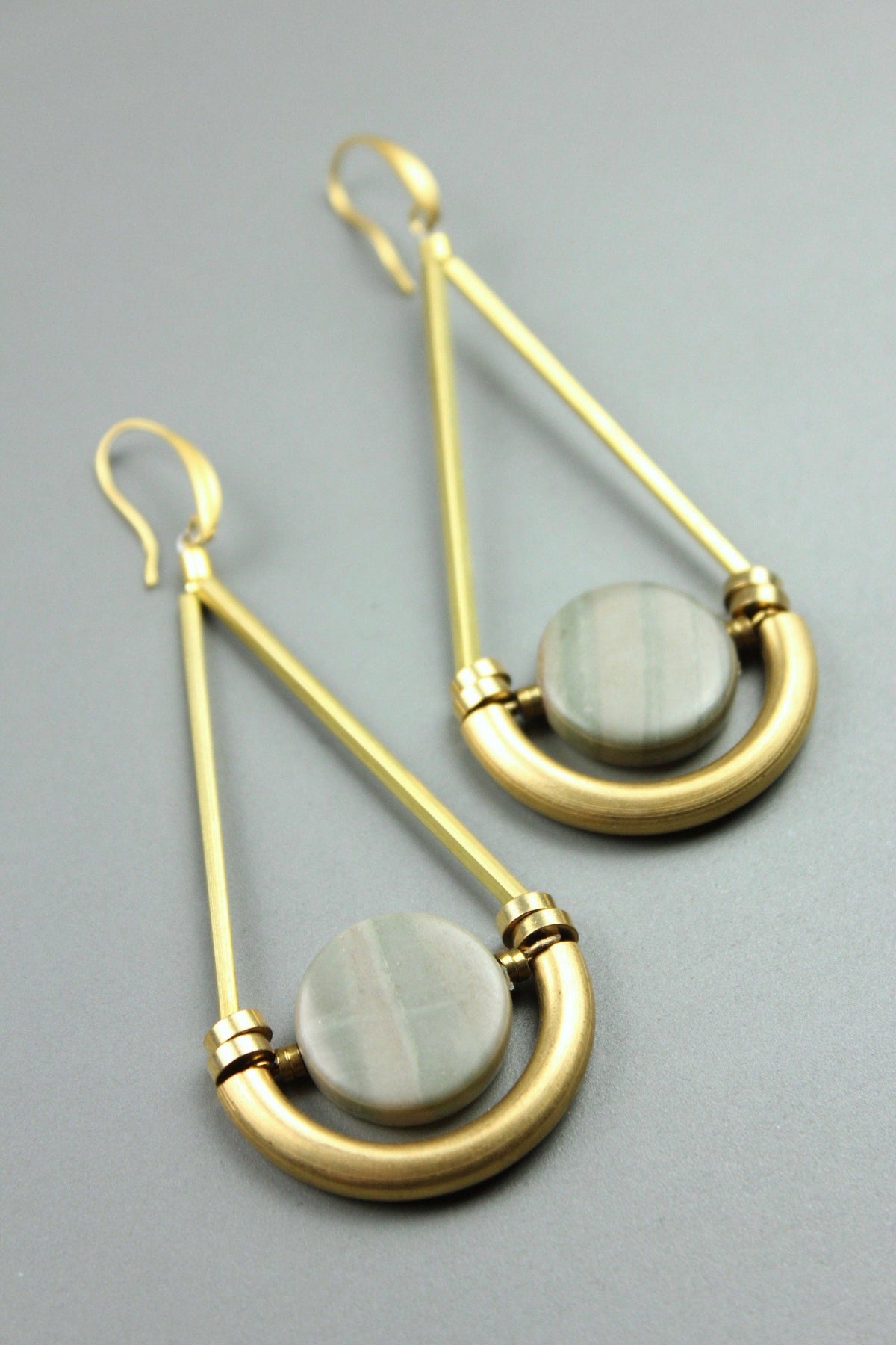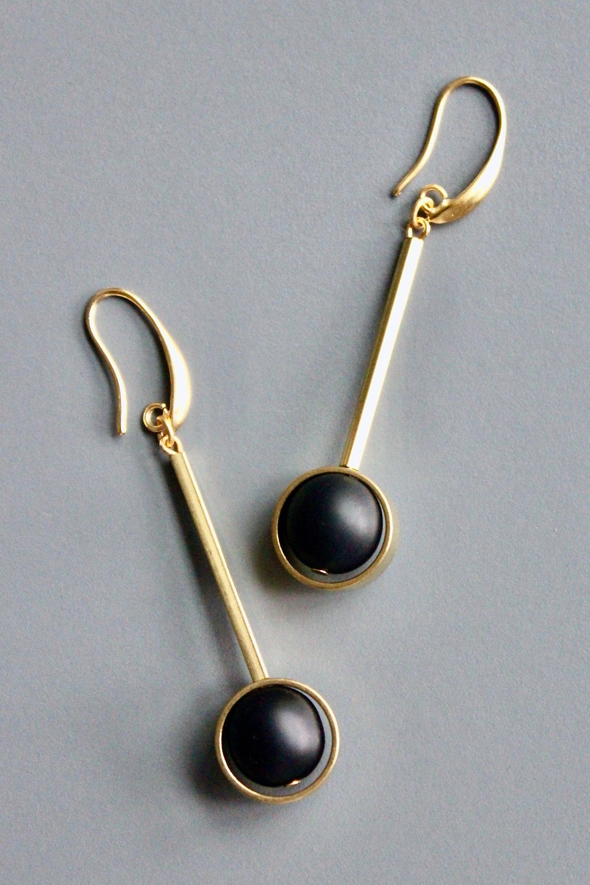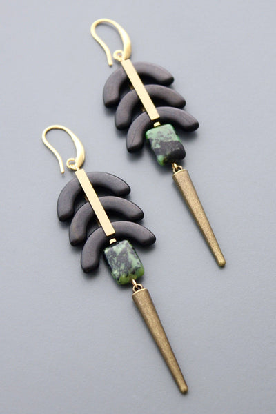 18k Gold plated brass hooks with vintage Japanese pressed glass, jasper, and glass. Each earring weighs .225 oz. and measures 2.75 inches in length from top to bottom.