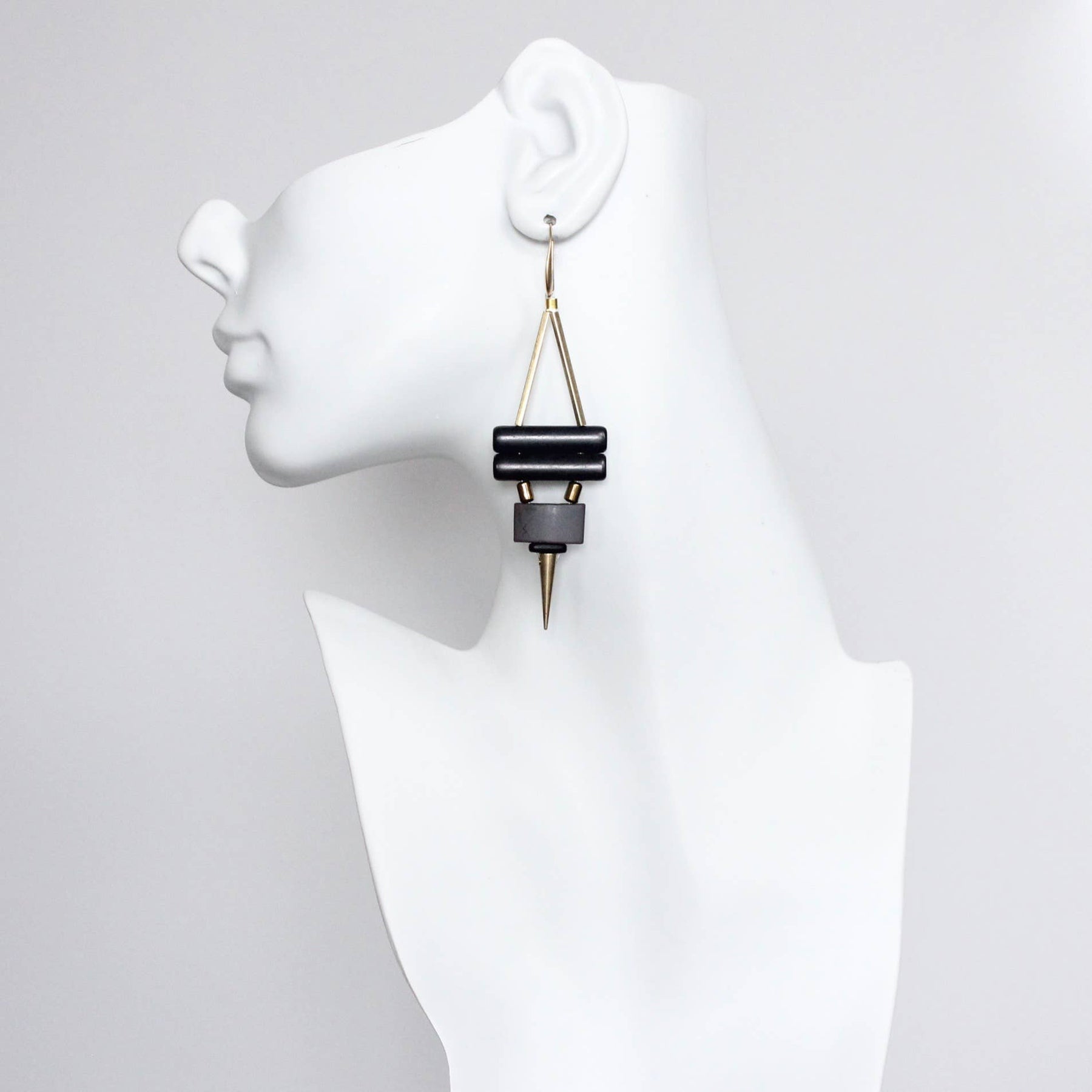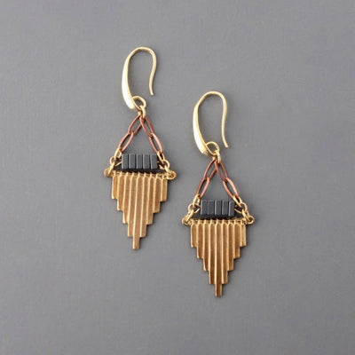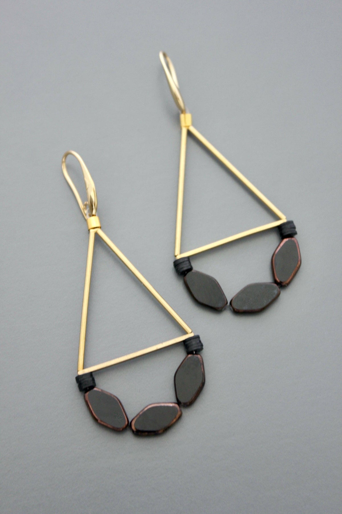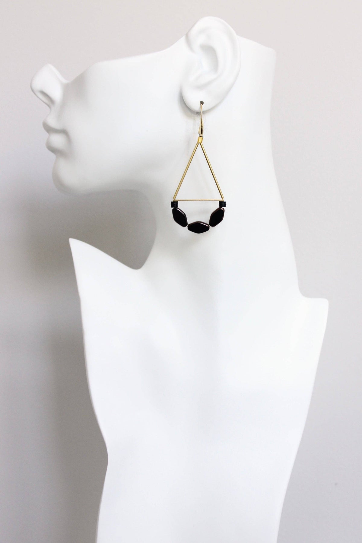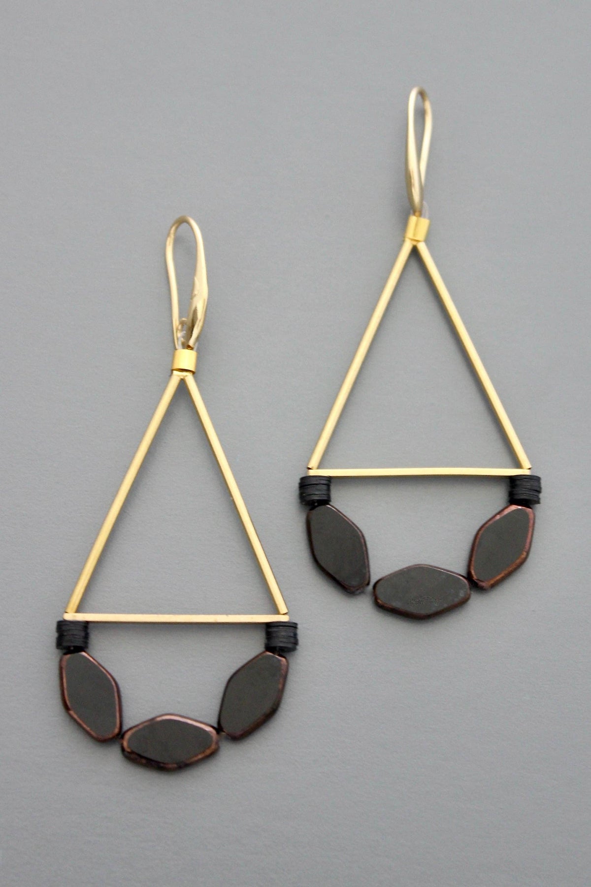 18k Gold plated brass hooks with vintage Japanese pressed glass, jasper, and glass. Each earring weighs .225 oz. and measures 2.75 inches in length from top to bottom.