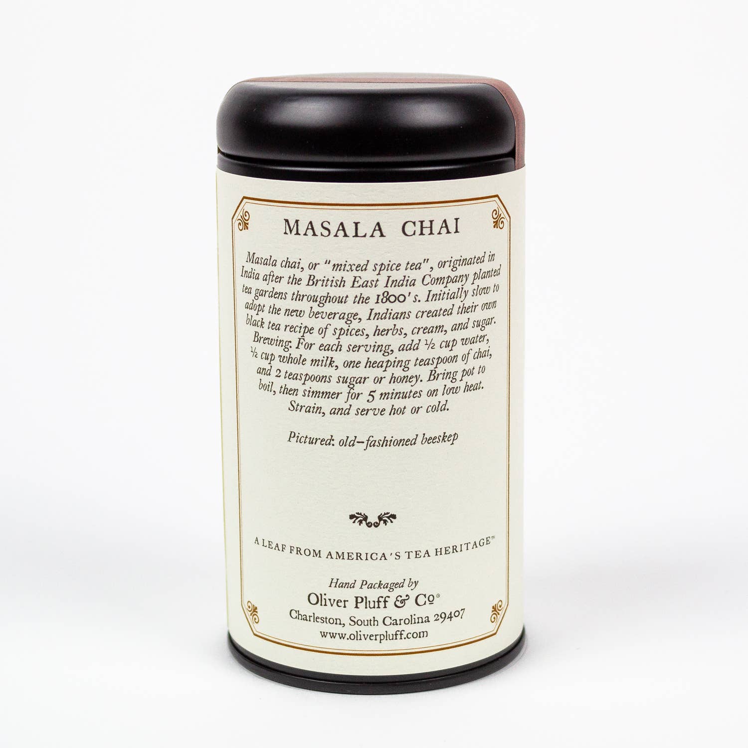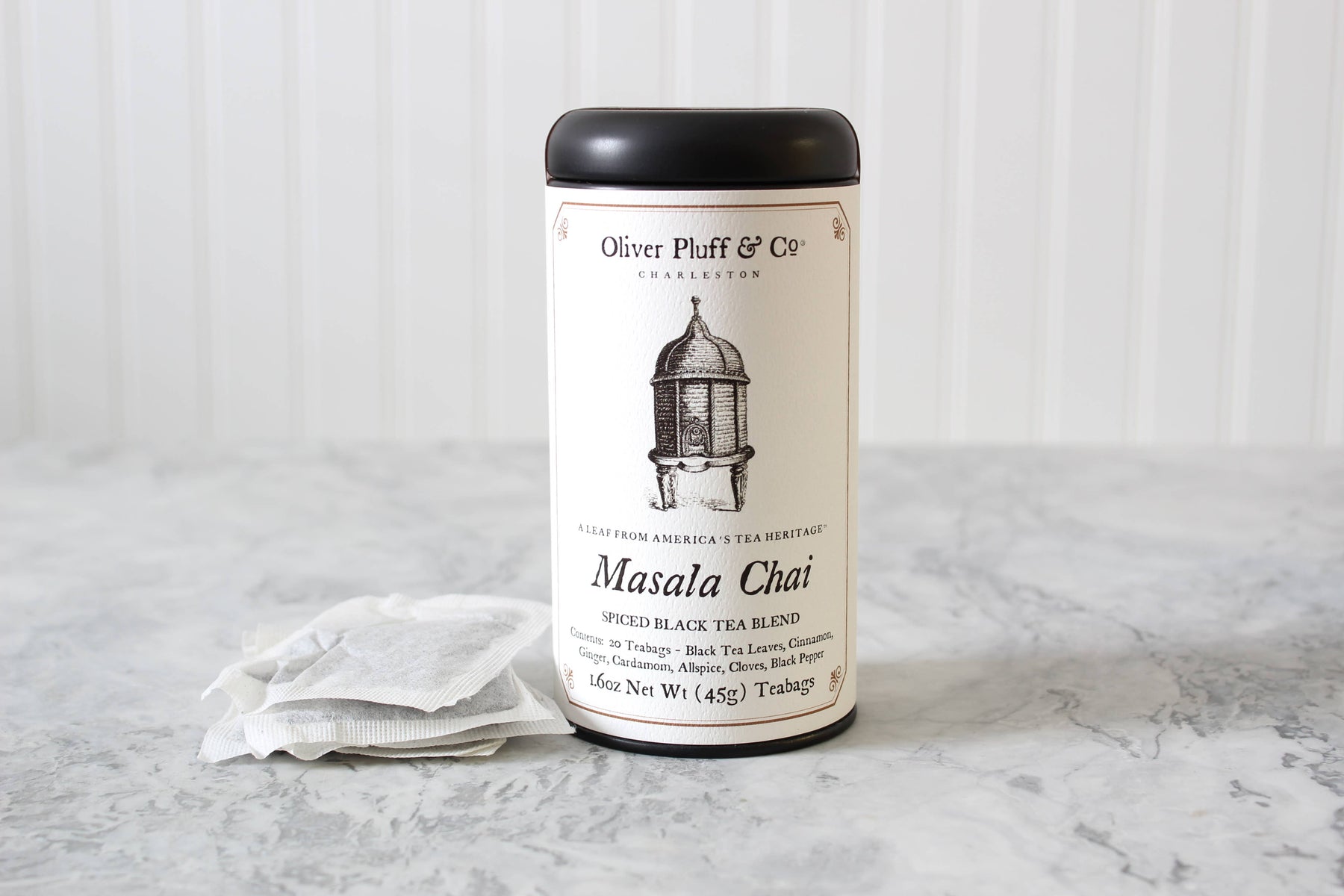 Ingredients: black tea, ginger, cinnamon, cardamom Size/Type: 20 Pyramid style teabags sealed in matte black signature tea tin Shelf Life: 3 Years Hand Packaged by Oliver Pluff & Co. in Charleston, South Carolina