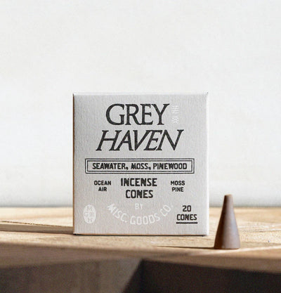 Bring the coast into your space. Greyhaven Incense Cones carry the cool, spicy tones of a seaside town nestled against the forest. Imagine walking out of Underhill’s woods and into salt air, mossy stone streets, spice markets, and morning rain. Each cone fills your space with a rich, earthy blend of ocean breeze, pine, brine, and soft spice — grounding, calming, and deeply atmospheric. - Includes 20 incense cones per box - Burn time: 35+ minutes per cone - Fragrance notes: salt air, pine, green moss, spice, white wine - Crafted from a blend of 12 premium essential oils. Great for daily rituals, meditation, or unwinding at home - Clean-burning and free of synthetic additives - Made in the USA
