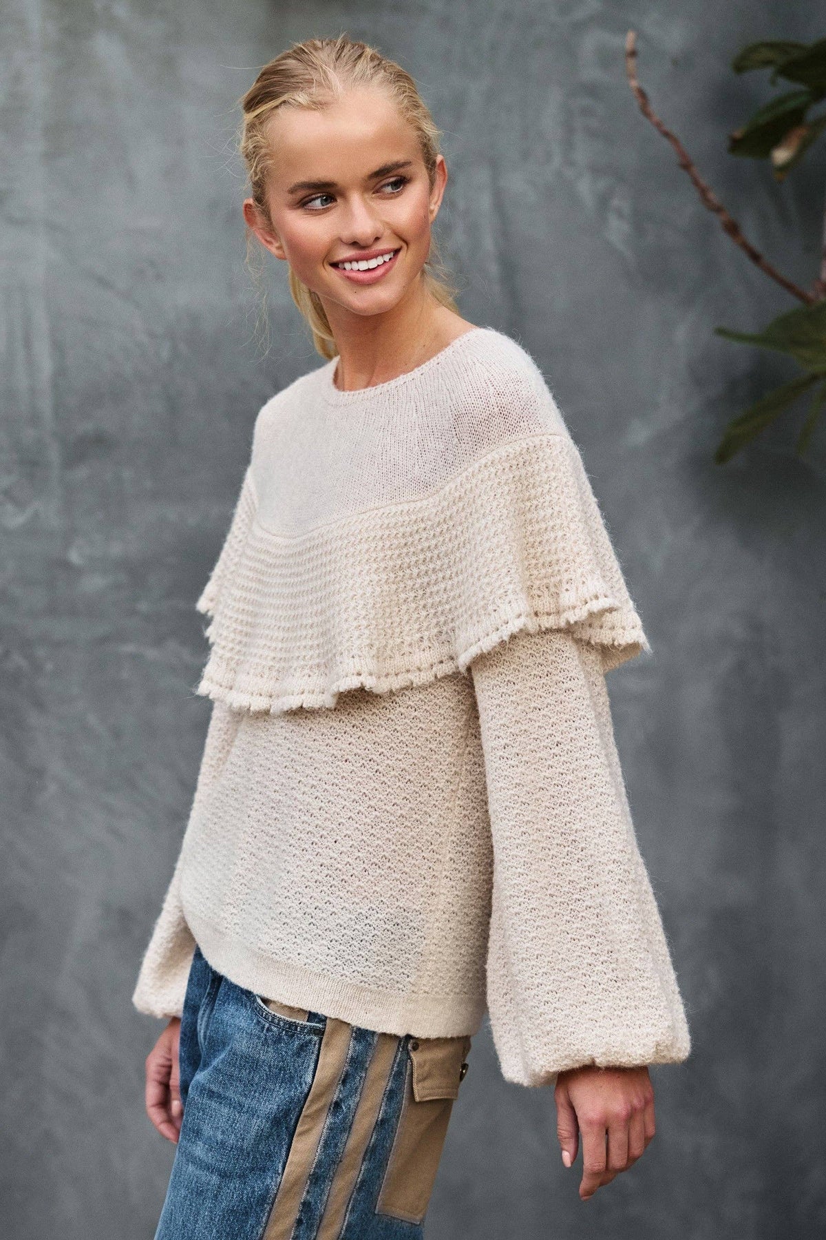 Ruffle Yoke Knit Sweater A soft, romantic knit with elegant volume and texture that brings a modern twist to feminine classics. • Creamy knit texture with delicate raised patterning • Statement ruffle yoke detail adds a graceful, vintage-inspired touch • Gently puffed sleeves with gathered cuffs for subtle volume • Back keyhole closure with buttons for a refined finish