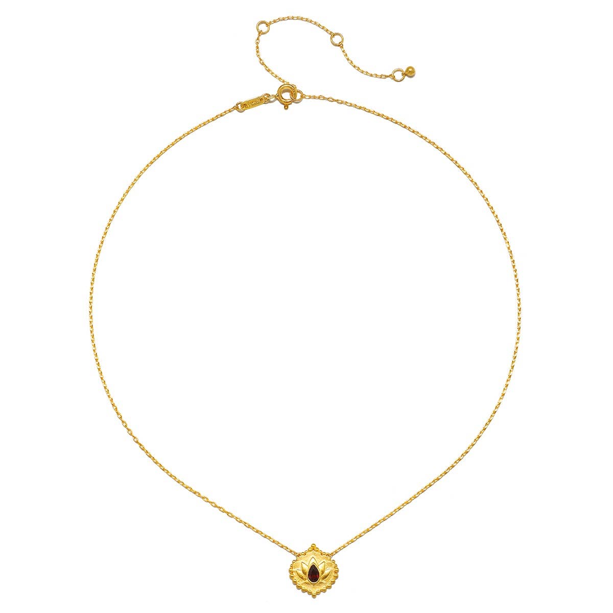 Grounded in strength, we are able to reach our full potential; we are called to bloom. A delicate 18kt gold plate pendant necklace with a finely etched lotus, symbol of new beginnings and full potential, is accented with a faceted garnet, a grounding stone that enhances strength, love, and internal fire. Wear this necklace to remind you that you are strong enough to begin anew; you are also meant to bloom.