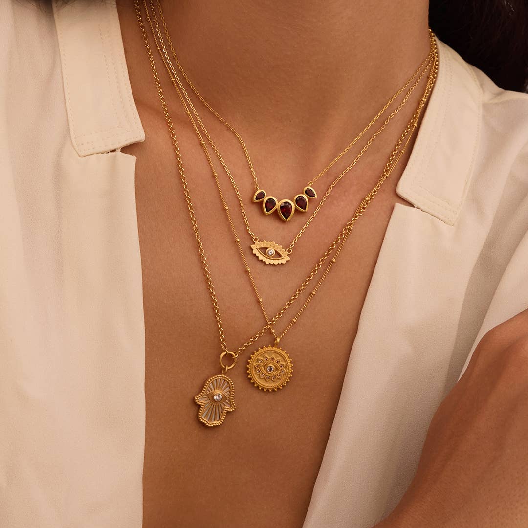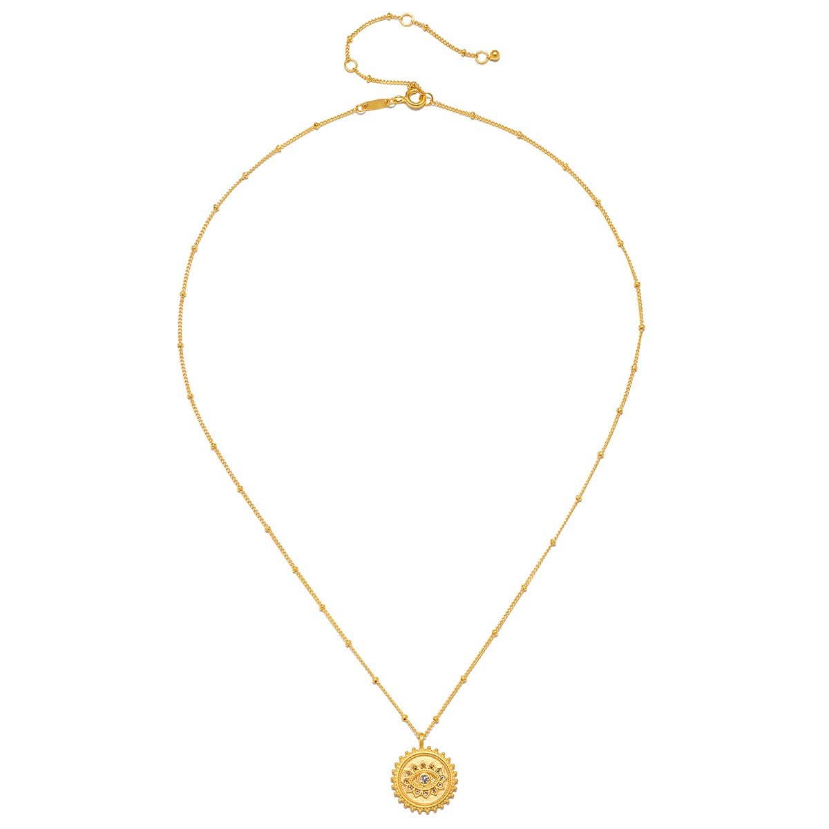 As we journey on our path to truth, we gain clarity of vision and purpose; with each step, an opportunity to transform. An 18kt gold plate coin necklace is accented with an evil eye, an ancient symbol of protection and intuition. White topaz, stone of clarity, helps to ignite intuition and strengthens powers of manifestation. Wear this necklace for feelings of protection and to help bring your dreams to fruition.