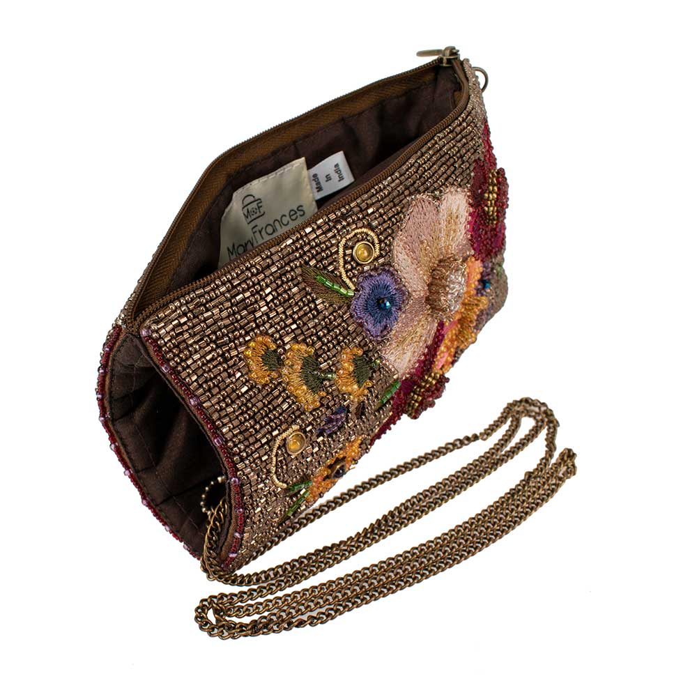 Features: Top hidden-magnet compartment, side zipper compartment, removable crossbody chain strap, fits cell phone